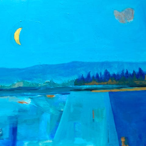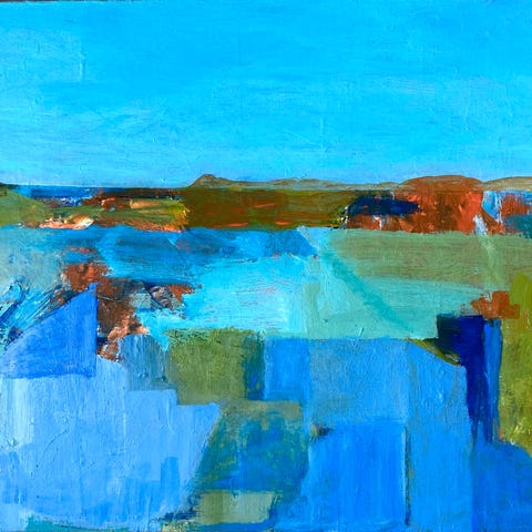 Abstrakt maleri " Postcard from the edge" - malt av Berit Wanvik. Det er 50 x 70 cm og er malt på sidene så det kan henges rett på veggen. Jeg kan sende med Norgespakke med sporing hvis du ikke har anledning til å hente!