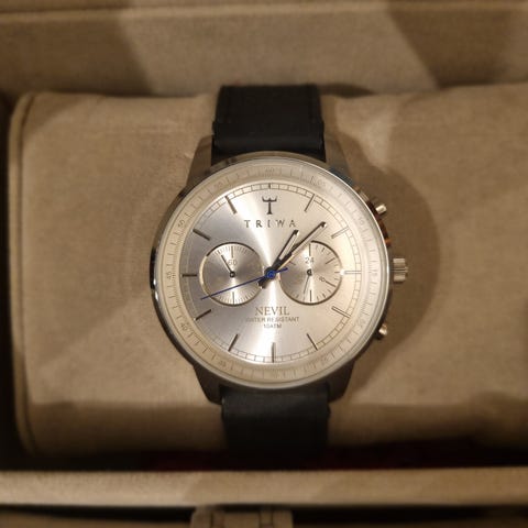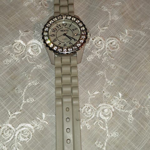 Kjempefin klokke med hvit skinnreim og fine stener/detaljer. Må skiftes batteri.
