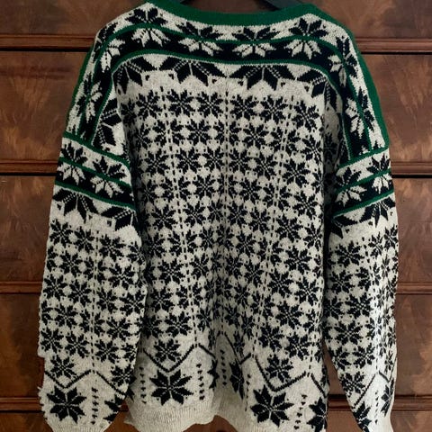 Dette er en 100% ullgenser i god kvalitet. Den har en liten flekk (se bildet). Har ikke selv prøvd å fjerne den, men ser ut som noe som muligens går bort i vask