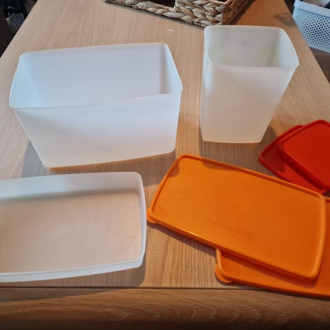 Rektangulære bokser for frysing, oppbevaring eller transport, ca 18 x 23 cm og den største er 30 cm - 130 kr og 250 kr