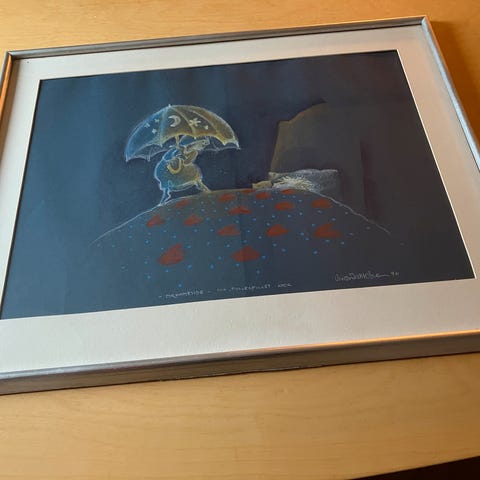 Originaler av kunstner Vivian Zahl Olsen benyttet i barne tv-seriene «Fru Pigalopp» (2 stk.) og "Sommeren på Mirabelløya" (1 stk.) i NRK, selges kr. 11.000,- pr. stk. For størrelse, se billedtekst. Illustrasjoner ikke merket med størrelse er alle laget på ca 40 x 60 cm papir. Selges på vegne av kunstner. Arbeidene kan etter avtale tas nærmere i øyesyn og kjøpes hjemme hos kunstners bolig i Røyken.