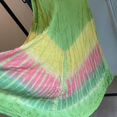 Kort stroppekjole med tropisk motiv. Kjolen er pent brukt, og er størrelse M. Materiale: 100% polyester. Jeg sender stort sett alltid første virkedag etter mottatt penger for frakt :)