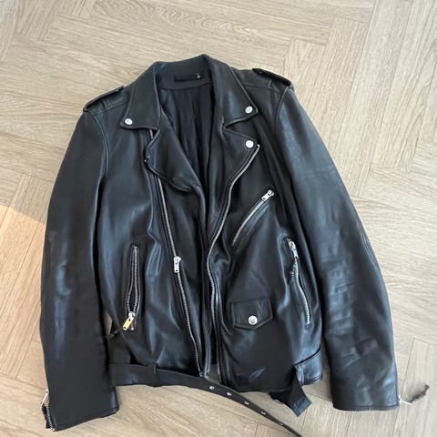 Be Edgy skinnjakke, som er ubetydelig brukt. Skinnet er av solid, god kvalitet og hetten er avtagbar. Jakken ble kjøpt ny i Munchen desember 2019, men er bittelitt for stor for meg (82 kilo/180 cm), så den har stort sett blitt hengende i skapet. Nypris var cirka NOK 3000,-.