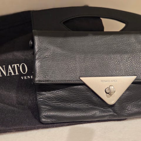 Sort skinn clutch fra Hugo Boss svært lite brukt selges. Kjøpt på Hugo Boss i London for noen år siden for kr 3300,-. Lengde bunn er 31cm, lengde åpning er 30cm, høyde 21cm, bredde bunn ca 3,5cm. Hvit skinn på sidene og clutchen kan evn holdes rundt det påsydde «håndtaket» med metalldetaljer og «HUGO» inngravert. Den er lukket med innesydde magneter, og har to lommer innvendig, den ene med glidelås. Kommer med dust bagen.