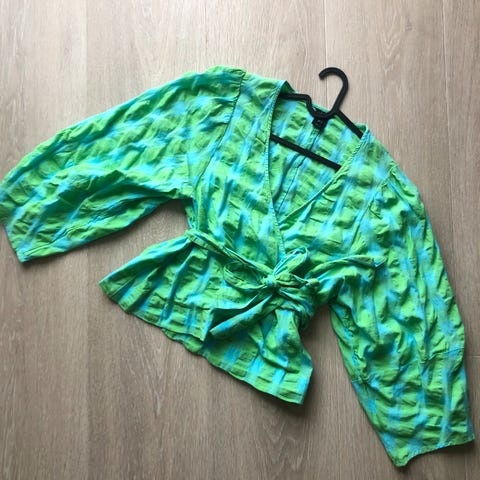 Superfin myk bluse i hvitt og limegrønn med lommer foran. Blusen er aldri brukt og er størrelse 34, men passer nok også til en 36. Materiale: 100% viskose. Jeg sender stort sett alltid første virkedag etter mottatt penger for frakt :)