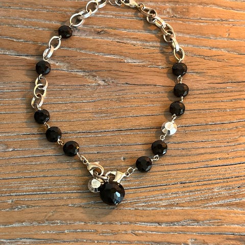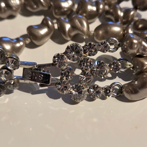 Blått og sølv med stener. Kjøpt hos gullsmed og kun brukt få ganger. Trenger en puss.
