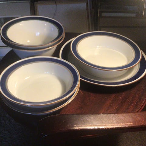 1. 6 stk dype tallerkener eller suppetallerkener, disse er brukte, har litt slitasje på gulldekoren. Disse er ca. Ø22,5cm.