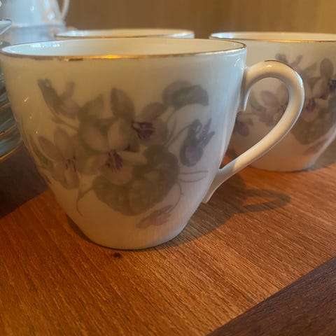 Selger gammelt kaffeservise fra PP med rosa blomster og gullkant. Det er ingen skader eller slitasje. Ser ubrukt ut. Komplett til 6 pers