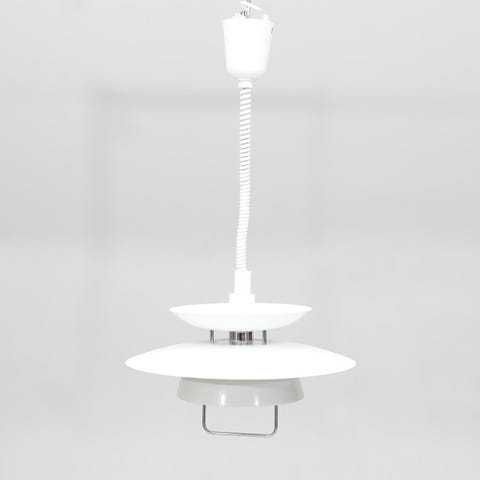 Fin Poul Henningsen lampe (1894-1967). PH pendel med skjerm av hvidt opalglass samt fatningshus av forkromet metall. Ø. 45 cm. Utført hos Louis Poulsen, model 'PH 4½-4' . Kan leveres I oslo og Vestfold området for 300kr