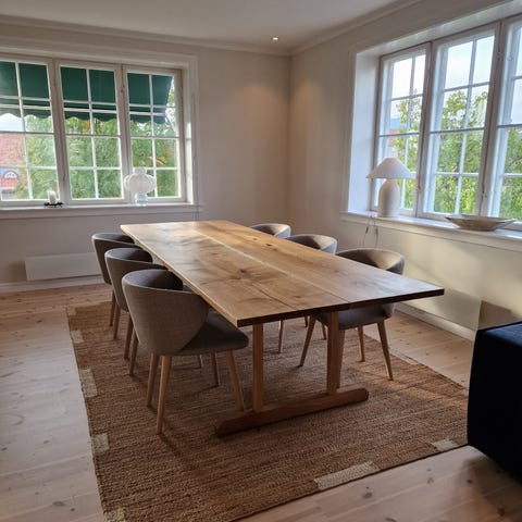 Bordet i annonsen er behandlet med høykvalitets hvit pigmentert olje som gjør bordet lett å holde rent + tåler vinsøl osv. finish etter ønske.