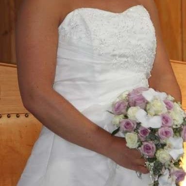 Demetrios brudekjole med slep (med hempe så det kan henges opp under dans og moro) og perler og broderier på toppen.