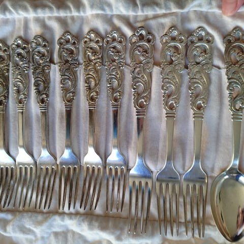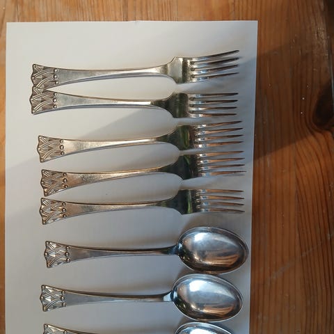 Brukt 40 GR bestikk. 6 skjeer lengde 18 cm og 6 gafler lengde 18 cm. Kan sende mot kjøper betaler porto. Meget pent brukt bestikk.