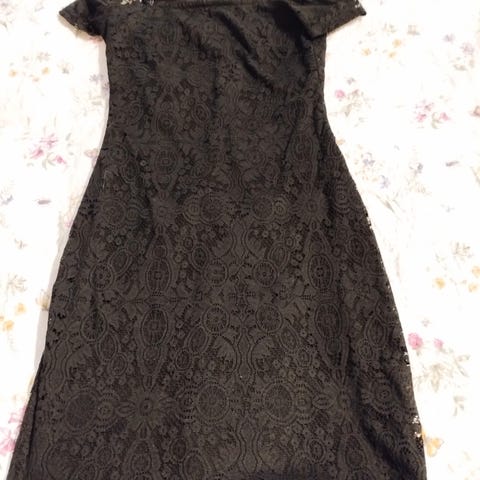 Mango svart kjole, i spansk / italiensk blonder retro stil, strapless, glidelås på siden, størrelse large. Kommer med belte i samme stoff.