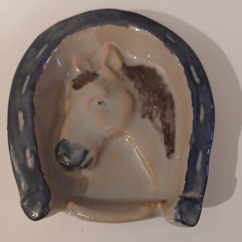 Gammelt askebeger formet som en hestesko, med gulldetaljer., 6,5x6cm. Hentes eller sendes mot porto.