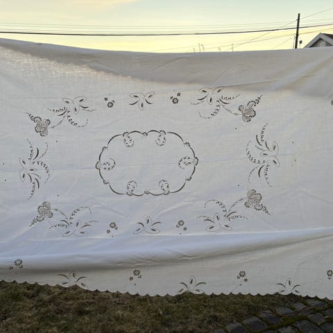 Flott gammel duk i creme, lys gul farge. Innvevet mønster og hulleffekt. Måler ca 120x115 cm. Ingen hull, men noen få svake småprikker har det med alderen blitt