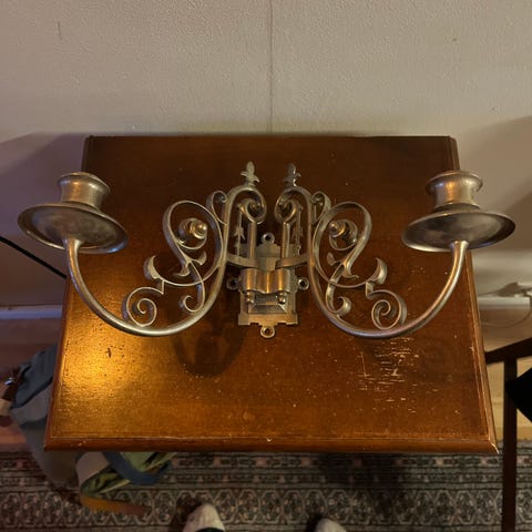 Pent brukt lysestake i metall til salgs. For stearinlys. Formet som et hjerte. Liten rutete sløyfe rundt foten (kan tas av), som gjør staken egnet til dekorasjon til jul.