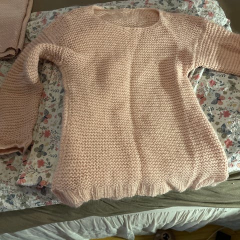 kr 500,- Nydelg hjemmestrikket rosa jumper med bling. Str. 12- 15 år