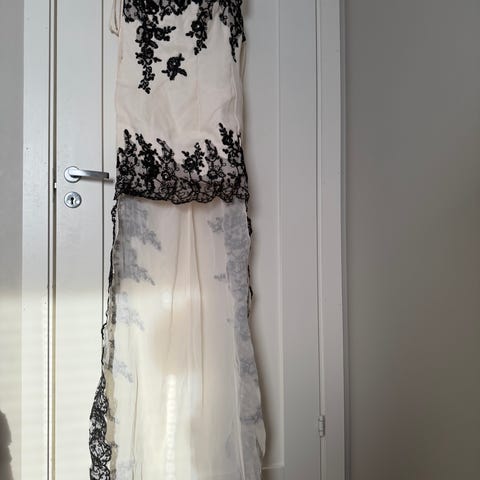 Paljetter, glitter og stas på overdel som går nedover kjolen.