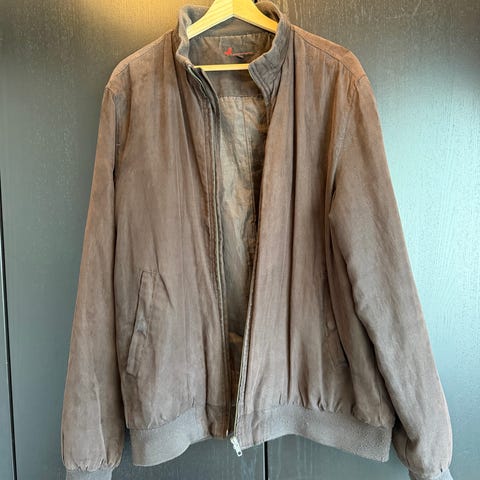Semsket 90-talls jakke str L. Helforet, brunbeige farge og mange gode lommer. Pent brukt.