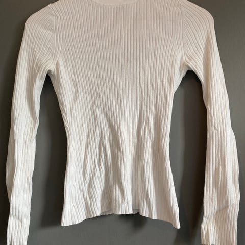 Ny eggehvit genser, str large. Ribbestrikket med liten trompetarm. Myk kvalitet: 77% viskose, 23% polyester. Genseren er fra Lindex, ny pris 299kr ( taggen henger på) Selges 200kr