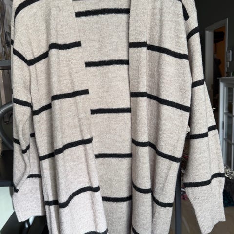 Ny Lang cardigan str. L selges. Ikke brukt, bare prøvd, fremdeles som er ny. En lengre cardigan i strikket kvalitet. Avslappet passform med lav skuldersøm og lange ermer. Ingen knapping.