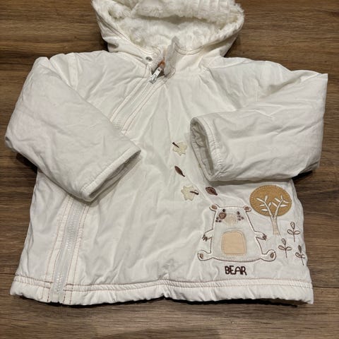 Helt ny ytterjakke fra Mexx i str. 68 cm (6-9 mnd). Nydelig i offwhite med brun pels i kraven og på ermene. Myk og behagelig.