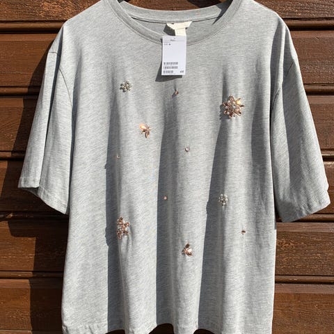 Pen langermet topp med steinpynt str. M/L selges. Brukt veldig lite, ikke noe bruksmerker. Alle steinpynt på. 95% bomull, 5% elastane. Kjøper betale frakt.