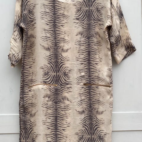 Nydelig kjole/ lang topp i 100% silke fra Zara. Sort og hvit dyreprint. Størrelse M, normal på størrelsen. Flott mønster. Kjolen er foret og sitter veldig fint på. Er ikke gjennomsiktig. Veldig anvendelig. Superfin over ei bukse eller strømpebukse/ tights, eller til bare legger på sommeren.