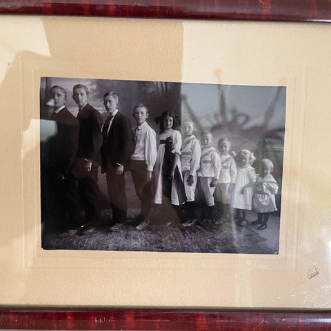 Passpartouet er preget med hans navn og adresse som da var Storthingsgaden 4. Der var han fra 1903 til 1931. Da er vel bildet tatt i den perioden. Etter kvinnenes klær og frisyrer vil jeg vel si at det var ganske i begynnelsen av denne perioden. Han hadde og flere adresser i Oslo også flere samtidig i perioder så han var nok en produktiv fotograf. Jeg har arvet bildet og det er nok originalrammen det er i. En kuriositet er at det var satt inn et bilde til i rammen. Derfor har jeg åpnet den og tatt ut det andre bildet. Baksiden på bildet skal være tapet med papirtape. Ettersom jeg fjernet det meste av den gamle tapen lot jeg være å sette på moderne plasttape. Stiftene er der og holder bildet på plass. Kr 750. Kjøper betaler porto. kr 73. (kanskje noen kjenner igjen kvinnene på bildet, eller kjenner til Olava Jenssen)