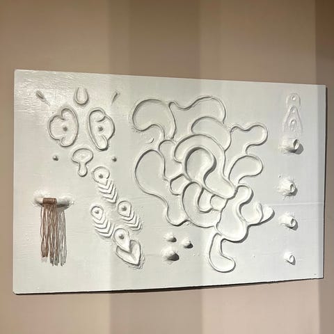 Akryl, glitter og ekte krystall (aventurin) på bomullslerret.