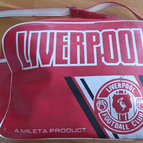 Nydelig velholdt Liverpool skulderbag fra 1978-79 selges 5000kr .Kun 1 eier og det er meg.Denne er 100 prosent ORIGINAL.Det menes med at den ikke er tukkla med eller sydd!!!Selvfølgelig slitasje etter tidens tann,fantastisk objekt i en Liverpool entustiast sin utstilling /samling.Glidelås fungerer.Hentes i Ski,Nordre Follo eller Kalbakken Oslo.Denne sendes ikke .