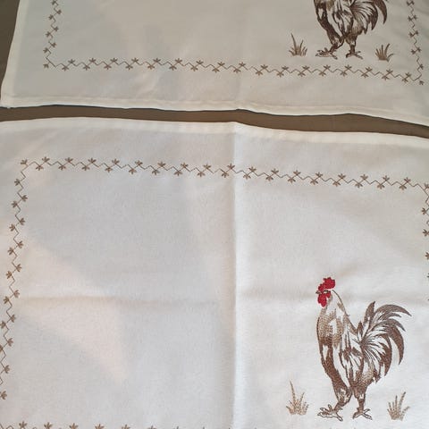 Selger disse 2 vatterte spisebrikkene med 2 servietter, som jeg har fått i presang, men aldri brukt. Spisebrikkene er 40x30 og serviettene 28,5x28,5. Jeg bor rett ved Østerås T-banestasjon, men kan også sende.