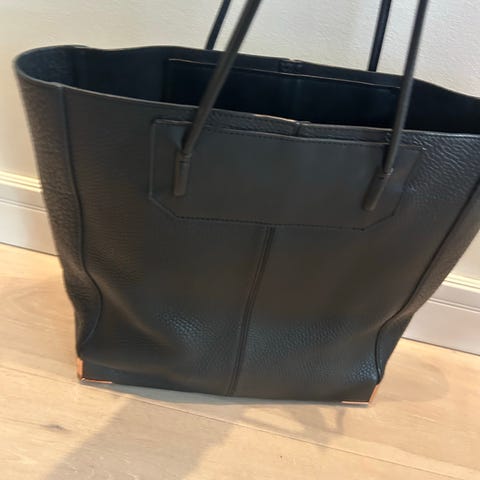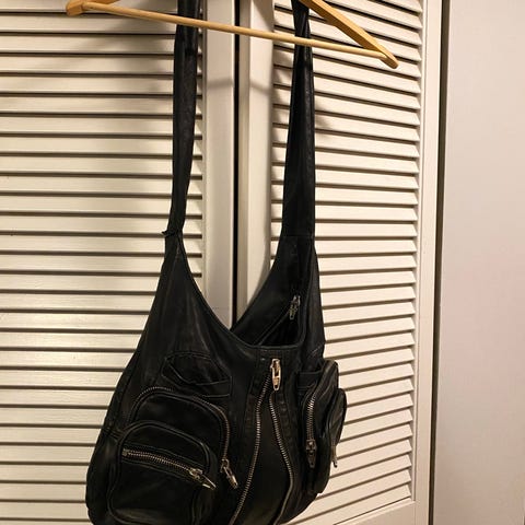 Alexander Wang skulderveske for dame laget i svart lær. Vesken har to håndtak og en avtagbar skulderrem med metallspenner. Den har en glidelås på toppen og metallbeslag i bunnen for beskyttelse. Passer til daglig bruk og oppbevaring av personlige eiendeler.