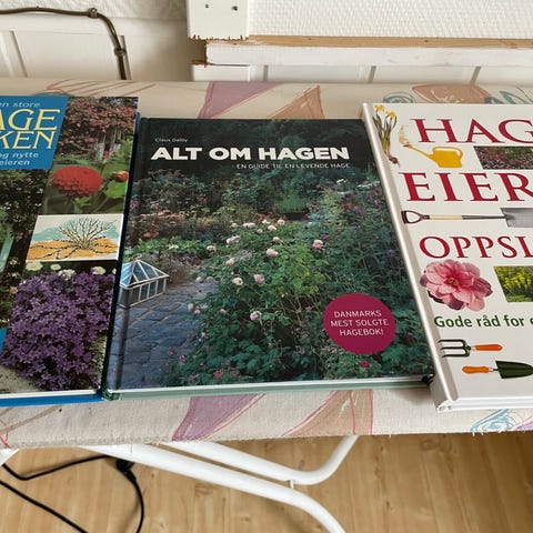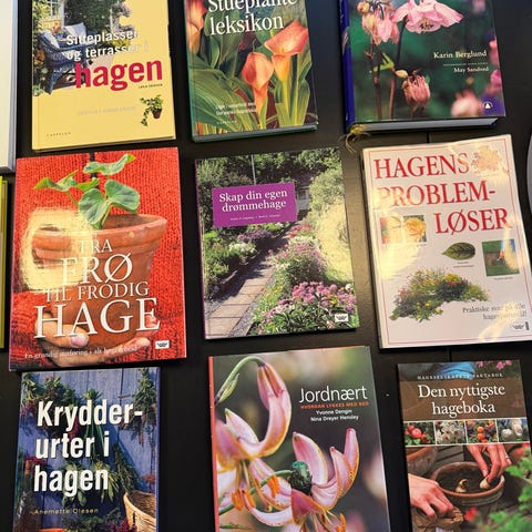 Et lite hagebibliotek med ti bøker som omhandler ulike hagetemaer.