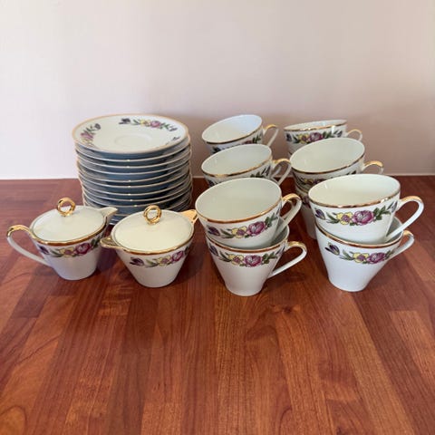 11 kopper, sukkerkopp, fløtemugge, 9tefat. Kan sendes mot at kjøper betaler frakt :-)