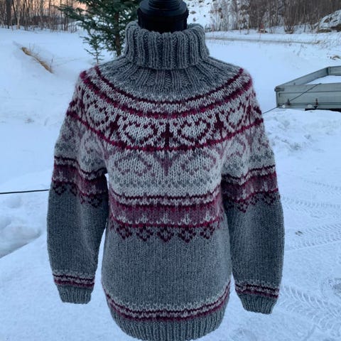 Strikkes i islandsk ull, som tåler litt regn og vind. Strikket i dyre og røykfritt hjem.