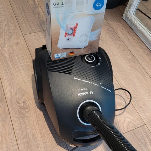 600 w. Vi kjøpte et sett med ekstrautstyr som leveres med. Vi har ikke ekstra poser, så det må kjøpes selv. Kjøpt ny for 3500,- + ekstrautstyr for 500,-