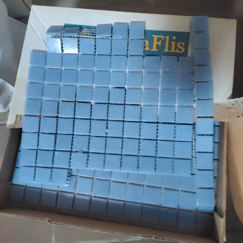 To esker med hhv 6 og 4 glassbyggerstein - til overs etter bygging av dusjvegg. Str 19x19x8 cm. Må hentes i Blystadlia, Rælingen