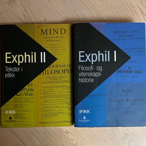 Jeg selger mine to ex.phil bøker. De kan kjøpes hver for seg eller samlet. "Ex.phil på 1-2-3" har noen få markeringer på de 2-3 første sidene om Platon, men er ellers i perfekt stand. Jeg anbefaler boken på det høyeste til de som skal ta ex.phil ettersom den var til STOOOR hjelp for meg! "Etikk II: Tekster i etikk" har ingen markeringer og er som ny (er faktisk ubrukt). Kan sendes hvis kjøper betaler for frakt.