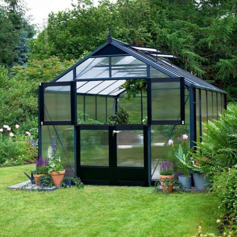 Et fint, kompakt drivhus som kan plasseres hvor som helst der det er ledig veggplass. Her kan du kan dyrke frukt eller blomster etter eget ønske. Solide vinduer av lettvekts polykarbonat, enkelt å montere og langt mer holdbart enn tradisjonelt glass, ingen tap av lys og derav bedre vekst. Avhengig av lokasjon, kan drivhuset benyttes det meste av året. Dybde 0,63 m. Lengde: 1,25 m. Sidehøyde: 1,22 m. Mønehøyde: 1,60 m.