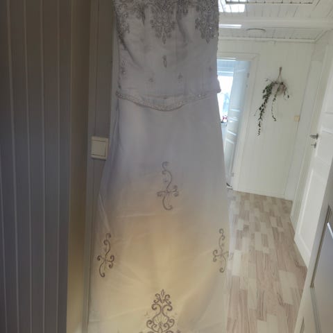 Enkel , men samtidig utrolig fin fotsid Romantica brudekjole i ivory farge str 14. Tilsvarer str 38-40. Jeg er 165 høy. Kjolen er helt ren og pen, ble renset i renseri. Stoffet er i myk som silk.