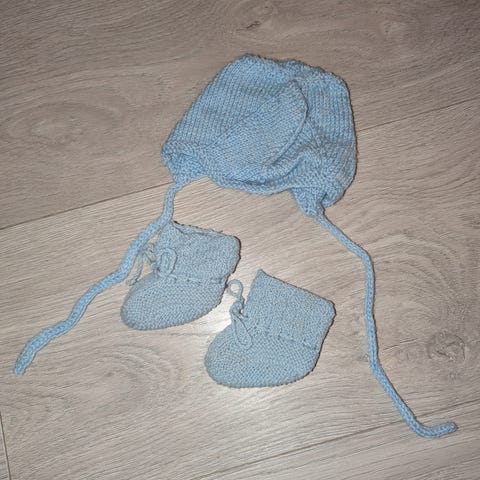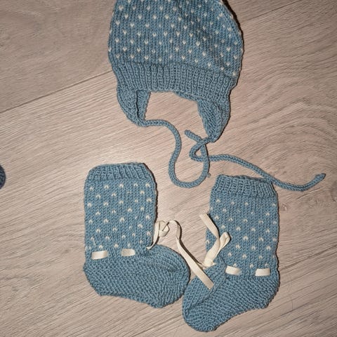 Hjemmestrikket sett til baby i merinoull. Kyse/lue og selbuvotter. Størrelse 1 år.
