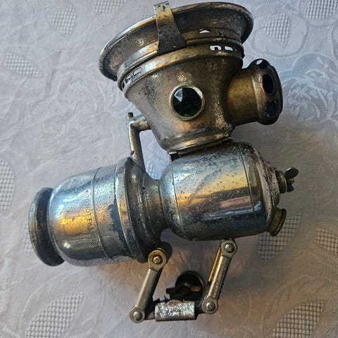 Har sykkellampe tilsalgs Germania Landtern Tysk prod.Denne er fra 1920 tallet . Lyset fra denne lykta ble produsert av parafin brenner i bunn av lampa.Lampa er i forholdsvis bra stand til å være 100 år gammal Ett flott samleobjekt. Samme type lampe står avertert på Ebay for 225 Euro= 2275 kr. Akseptabelt bud ønskes .Ny lavere pris 2 april 2026.