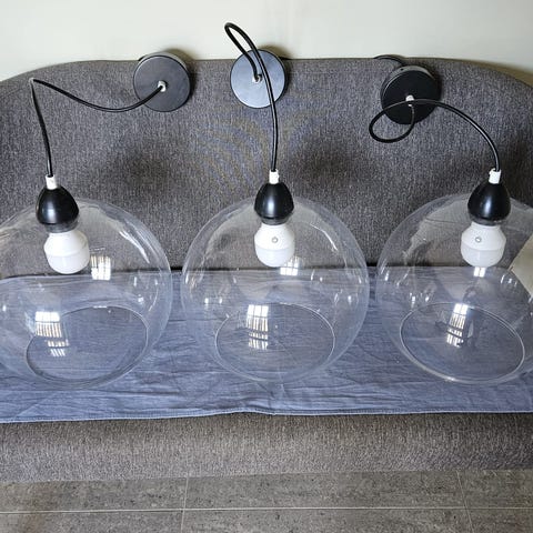 4stk pendler i klart glass med kobber oppheng. Dimmbare LED-lamper med «glødetråd» følger med og ledningsforkortere for fleksibel lengde på pendlene.