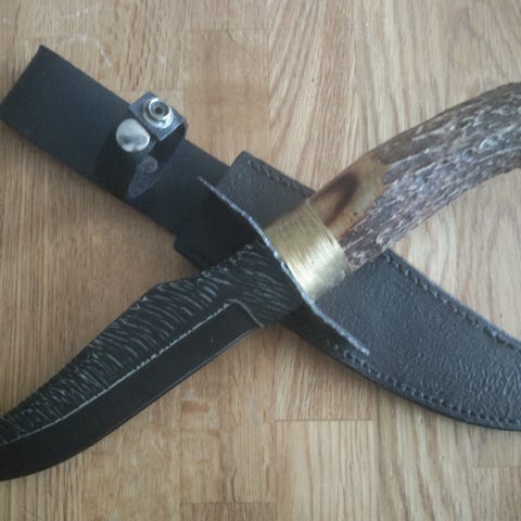 Knivsliren er laget av reinsdyr gevir og rårandslær. Håndgravering i gevir.
