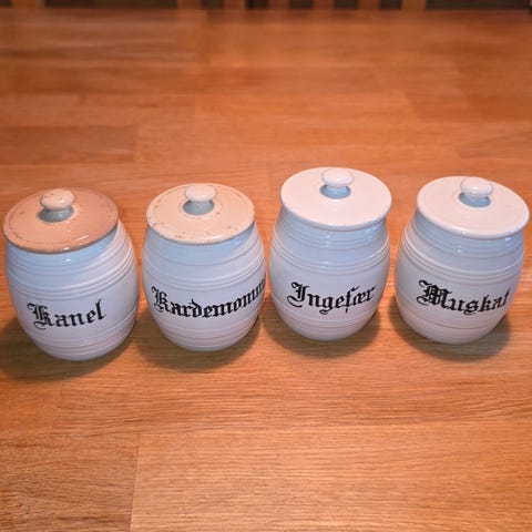 Stråmønster krydder- og krukke sett fra Villeroy&Boch, Dresden( 1874-1909). Antar det skulle vært en stor sukker krukke også? Ellers komplett. Litt misfarging og krakeleringer. Skader + kraftig krakelering på 2 krydder krukke lokk. Større krukker i bra stand alderen tatt i betraktning!( 100 + år).