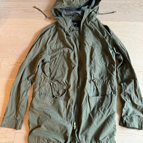 Veldig tøff jakke fra Bikbok med detaljer og logo på hette og arm. Metallknapper, figursydd. Militærgrønn og sorte detaljer. Selges 150.-