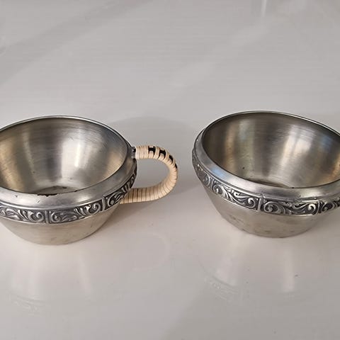 Flott sukker og fløteskål som pynter opp til kaffe på spisestua.