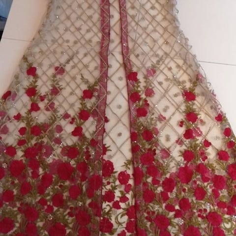 Lang damekjole i størrelse M. Kjolen har flerfarget mønster med hovedfarger i krem, turkis og brun, samt rosa detaljer på ermene. Modellen har lange ermer og rett passform, og går til ankellengde. Egnet som selskapskjole eller hverdagskjole avhengig av styling.