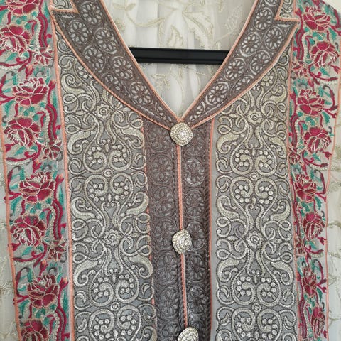 Lang kjole for dame i størrelse M. Kjolen har flerfarget mønster med dominerende turkis og gullfarget dekor. Den har lange ermer i transparent stoff og et heldekkende brokade- eller blondepreg i front og bak. Passer til bruk ved høytider, selskaper eller andre anledninger der man ønsker en tradisjonspreget og dekorativ kjole.